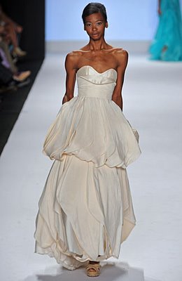 Leanne’s wedding dress, and collection, was inspired by water and movement. Nina Garcia was right on when she described it as “modern and dreamy.” We’re pairing these gold