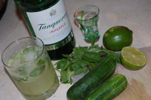 This refreshing summer beverage was adapted from a recipe found over at What’s Gaby Cooking (but originally inspired by a Miss Mojito post from a few years back). Gaby probably had some time to think about, and plan for, her preparation of this cocktail. Ms. S&C’s preparation was a little last minute, and she didn’t have the patience for simple-syrup-making and pureed-cucumber-straining. So, her adaptation went something like this. (With more time, she would recommend the simple syrup making and cucumber puree straining.)